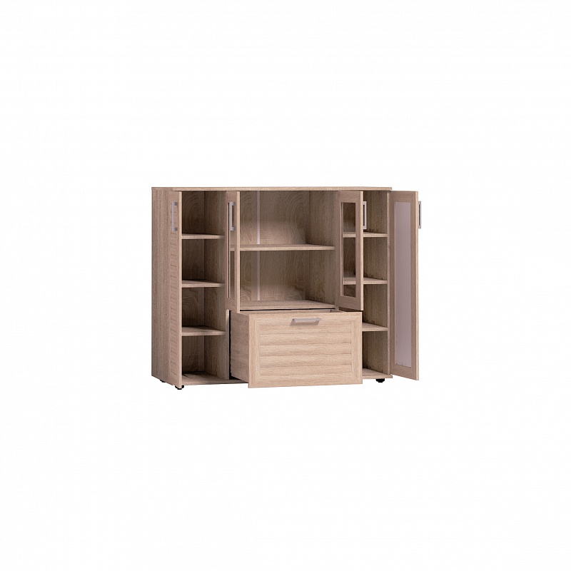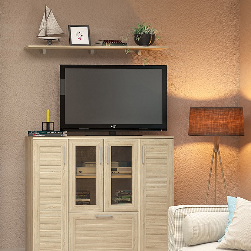 Как более рациональный и вместительный предмет интерьера, который также подойдет для установки ТВ, предлагается 5 Тумба МЦН. Это достаточно высокий модуль (1035 мм), который может быть использован как комод или небольшая витрина в обеденной зоне. Центральные рамочные фасады со стеклянным вкладышем скрывают нишу с полкой из ЛДСП, регулируемой по высоте. В боковых отделениях с глухими фасадами расположены по три полки с каждой стороны. Вместительный нижний ящик на шариковых направляющих полного выдвижения выдерживает нагрузку 13 кг.