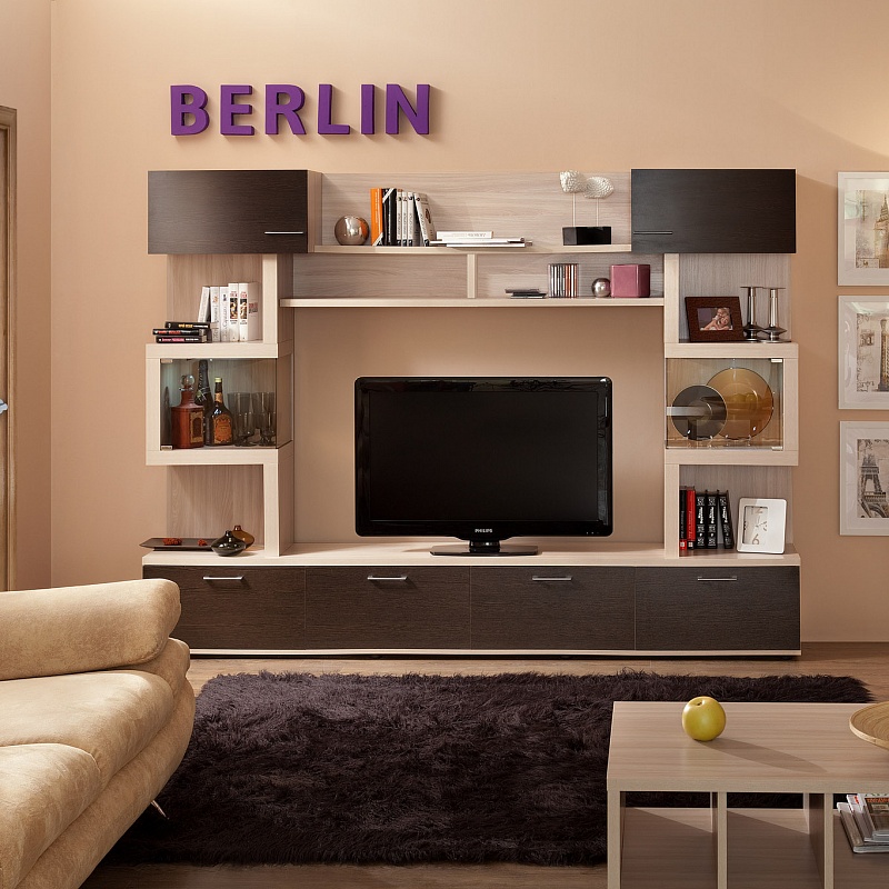 Современная мебель для гостиной под телевизор с большим набором ниш и глубокими выдвижными ящиками внизу. Для стандартного КОРПУСА предусмотрены два варианта цветового решения ФАСАДА: один в декоре Шоколад Глянец , другой - Венге. Выбирайте и заказывайте любой из них. Подсветка входит в комплект. Подлинные радиусные фасады не деформируются со временем, придают интерьеру современный вид. Выдвижными ящиками в тв тумбе пользоваться гораздо удобнее, чем нишами с распашными дверцами. Глубина ящика - 30 см.