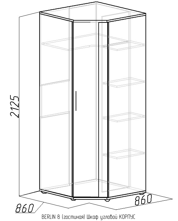 Рационально использовать обычно пустующие углы в комнате позволит угловой шкаф. Наполнение шкафа состоит из стеллажа с четырьмя полками, стационарной штангой для одежды длиной 81 см и автоматической встроенной подсветки. Светильник зажигается только, если открыта дверь.