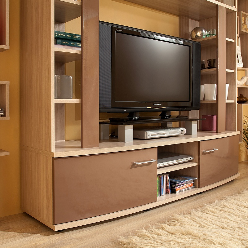 Современная тумба под телевизор с двумя нишами для тв-аппарутры в центре. Распашные дверцы по бокам. Стеклянная подставка под телевизор не идет в комплекте, можно купить отдельно.