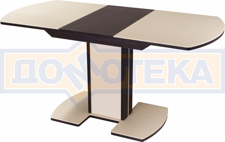 Оснащен раздвижным механизмом раскладки. Для того, чтобы разложить стол серии Румба достаточно потянуть за одну из половинок столешницы и установить вложенную в основание между столешницами вставку, сдвинуть полукрышки до упора и закрепить специальным зажимом.