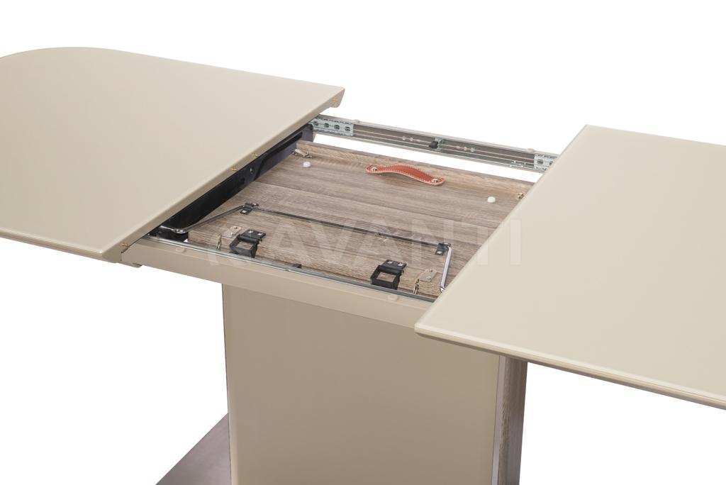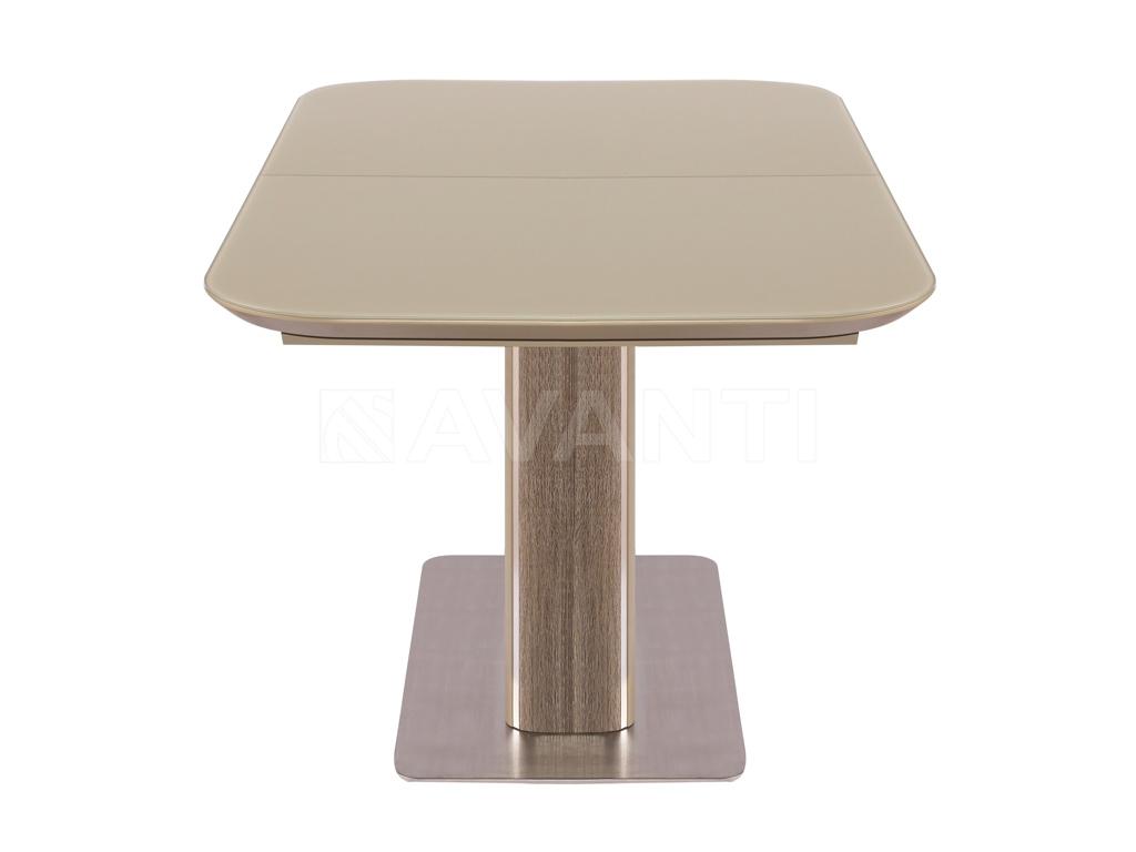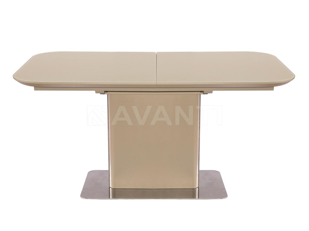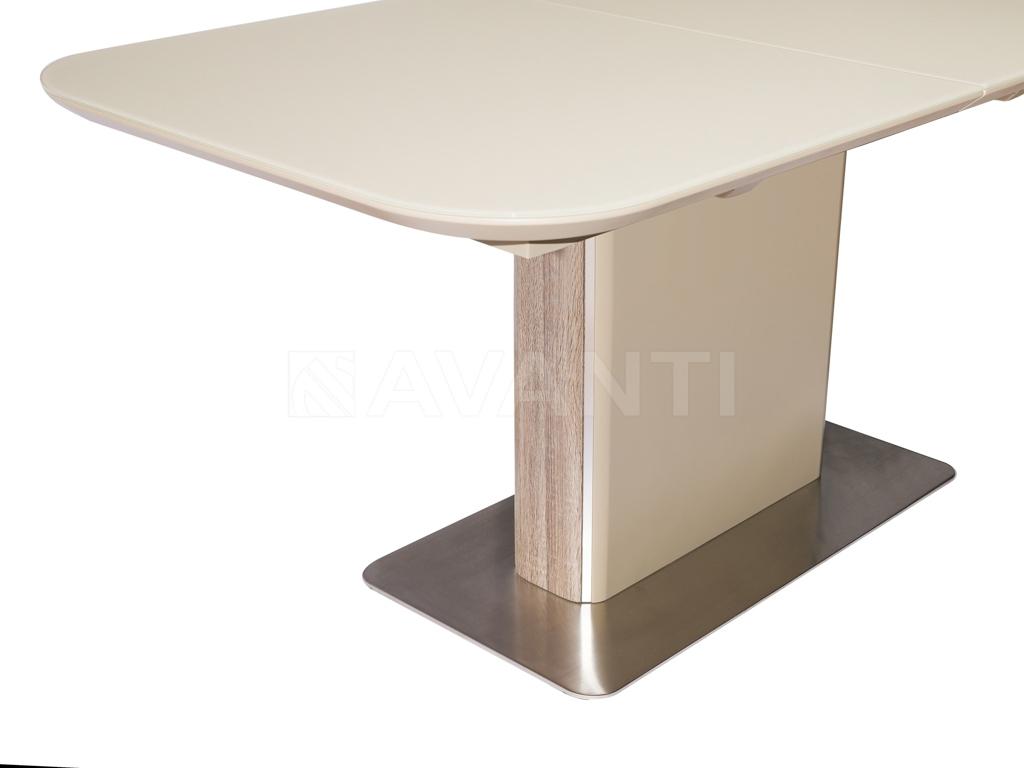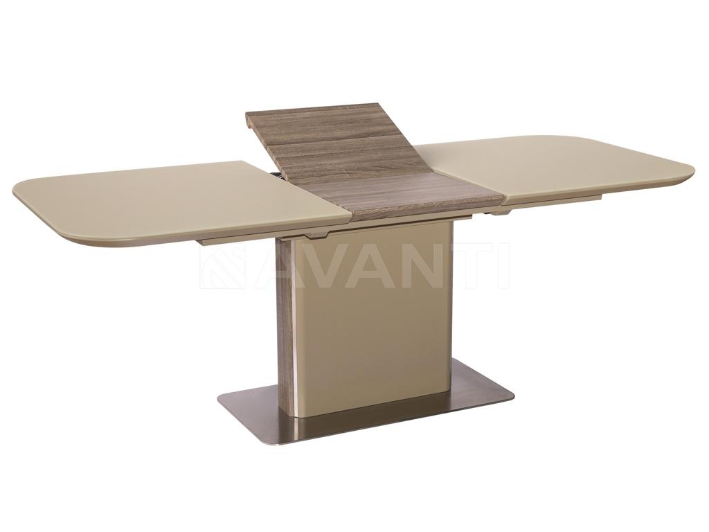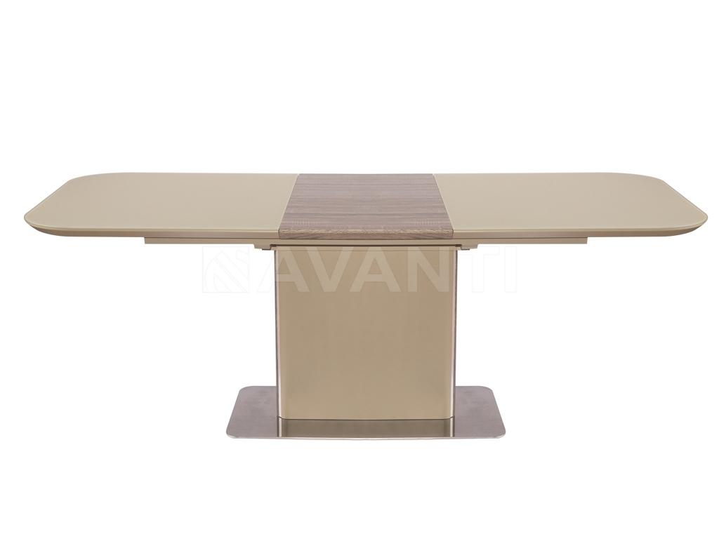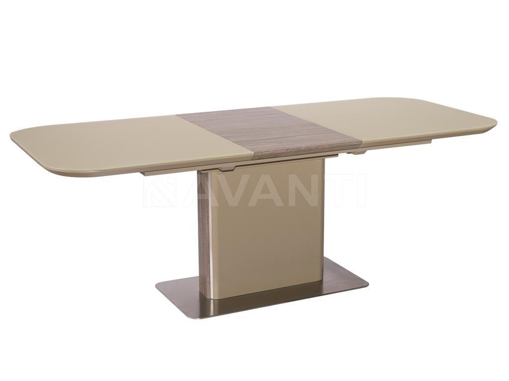 Лаконичная форма бежевого лакового стола ALFA с контрастной вставкой сразу привлекает внимание чёткими линиями, переходящими в закруглённые углы. Столешница представляет собой комбинацию закаленного сатинированного стекла цвета мокка, контрастной коричневой вставки и матового лака. Этот современный обеденный стол органично впишется в интерьер даже небольшой гостиной. Вставки из матовой стали на колонне отлично гармонируют со стальным матовым основанием. Раскладной механизм позволяет в одно движение увеличить размер столешницы со 160 до 210 cм.