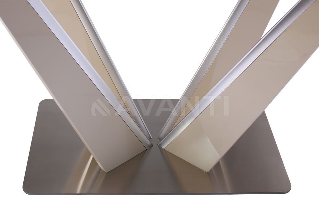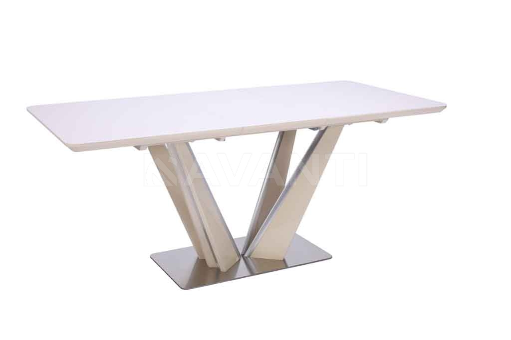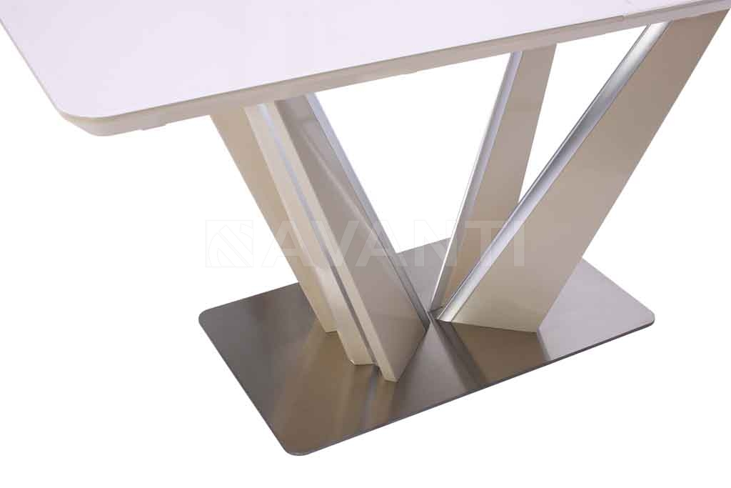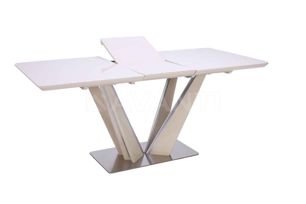 Современный обеденный стол ATLANT сразу обращает на себя внимание необычной формой базы, которая состоит из четырех колонн необычной форму. На базу опирается столешница, сочетающая в себе лак и закаленное стекло. Выполненная из МДФ вставка позволяет увеличить столешницу на 50 см. Стальное основание повторяет прямоугольную форму столешницы.