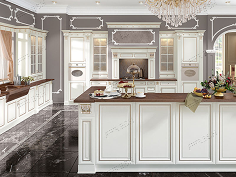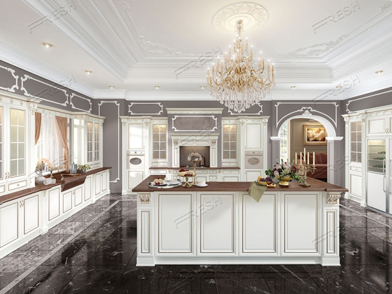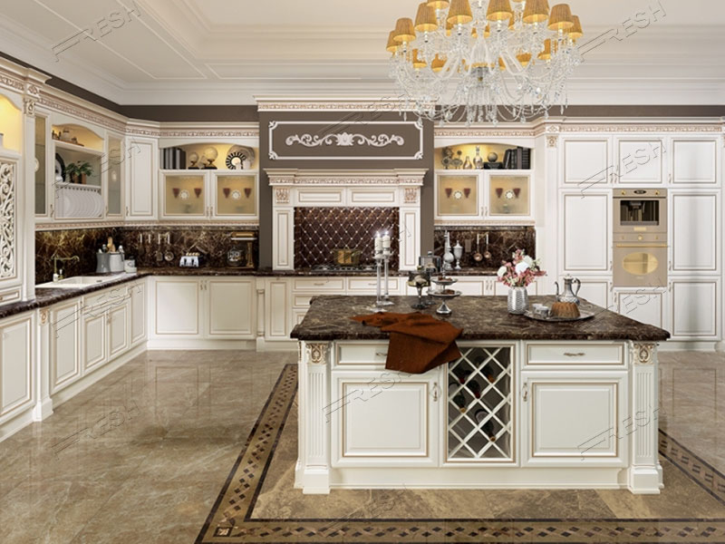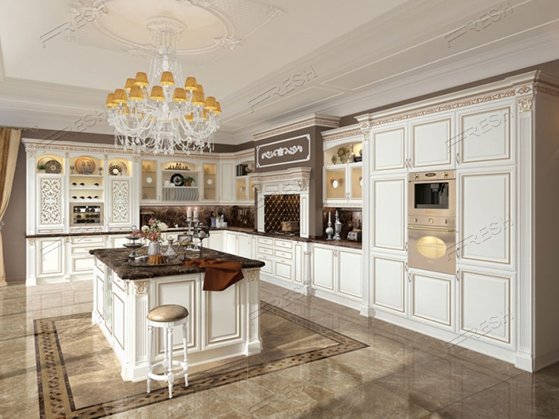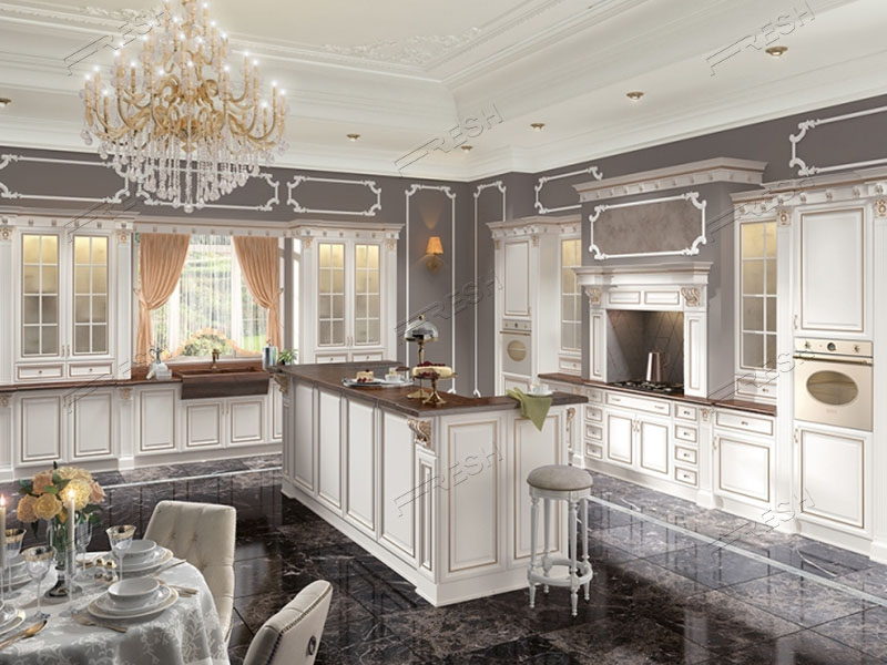 Наполненная светом и теплом кухня с ажурным рисунком и изысканными кристаллами Swarovski® создана для того, чтобы радовать и восхищать. Нежный белый ансамбль в стиле «Ампир» украшен гармоничными арками, резными стройными колоннами. Пилястры венчает виноградная лоза – символ плодородия, радости жизни и молодости. Плавные изгибы рисунка фасадов и карниза – дань природе, которая всегда вдохновляла античное искусство. Глянцевый лак отражает и рассеивает солнечный свет, рождая жемчужное сияние. Изящные строгие витражи с алмазной гранью перекликаются с прохладой серебристой патины на фасадах, изготовленных итальянскими мастерами из массива липы.