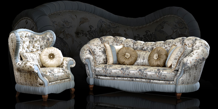 Обычно применяется велюр различных оттенков с рисунком или однотонный, а чехлы декоративных полушек шьются из жакарда. Возможно добавление пришивных плоских кристаллов Сваровски. Роскошь в этой модели весьма уместна.