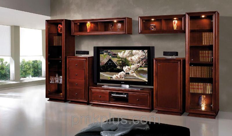Набор мебели для гостиной Эвелина отличается современным дизайном, высоким художественно-декоративным исполнением и эстетичностью за счет использования рамочных дверей с профильной обработкой, тогированных стекол, подсветки и стильной ажурной итальянской фурнитуры.