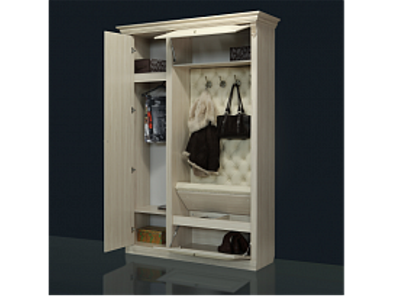 Прихожая Благо 5 выполнена из высококачественно ЛДСП с использованием декоративных элементов из МДФ, объемных фасадов из эко кожи. За основу дизайна данной мебели для прихожей были взяты лучшие традиции и тенденции итальянской классической мебели. Это выражено и в великолепных широких пилястрах, которые подчеркивают дополнительную строгость и консервативность, создают конкретные очертания, и в необычайной красоты, объемных кронштейнах, придающих дополнительную роскошь, блеск и лоск данной прихожей.