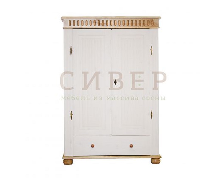 Шкаф распашной предназначен для хранения предметов одежды. Представляет собой каркас с одним отделением и выдвижным ящиком. Отделение оснащено стяжной полкой для головных уборов в верхней части и двумя металлическими штангами для вещей. Задняя стенка шкафа - вагонка. Двери деревянные с сплошной филенкой.
