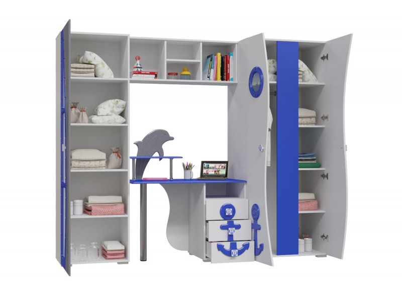 Парус Шкаф П-1 + Стол письменный П-2 + Полка П-3 + Пенал П-4. Оригинальная стеночка для комфортного оформления комнаты юного романтика и фантазёра! Украшение мебели выдержано в морской тематике - накладки-якоря, иллюминаторы и улыбчивые дельфинчики! Удобный шкаф со сказочными фасадами с яркими якорями и иллюминаторами, станет украшением детской кают-компании. Стильный стол имеет комфортную столешницу с закругленными уголками яркого синего цвета и правую стойку из хромированного металла. Тумба оборудована тремя выдвижными ящиками на шариковых направляющих и открытой нишей, декорирована якорем и оригинальными ручками.