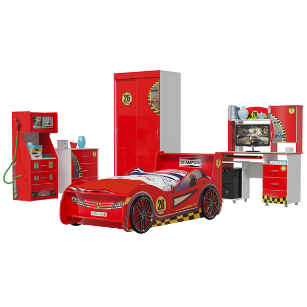 Формула Детская № 1. Кровать в форме гоночного болида, шкаф-купе, комод классический, комод в виде бензоколонки и компьютерный стол - всё выполнено в особенном, колоритном и стильном дизайне Формулы. Яркий, дизайнерский набор мебели для детской комнаты подарит радость и комфорт Вашему сыну.