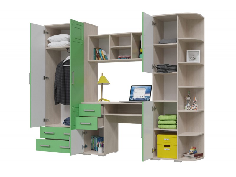 Стол с тумбой, навесной шкаф с открытыми полочками, стеллаж и шкаф платяной порадуют, как практичностью и функциональностью, так и стильным дизайном Вас и Ваших детей.