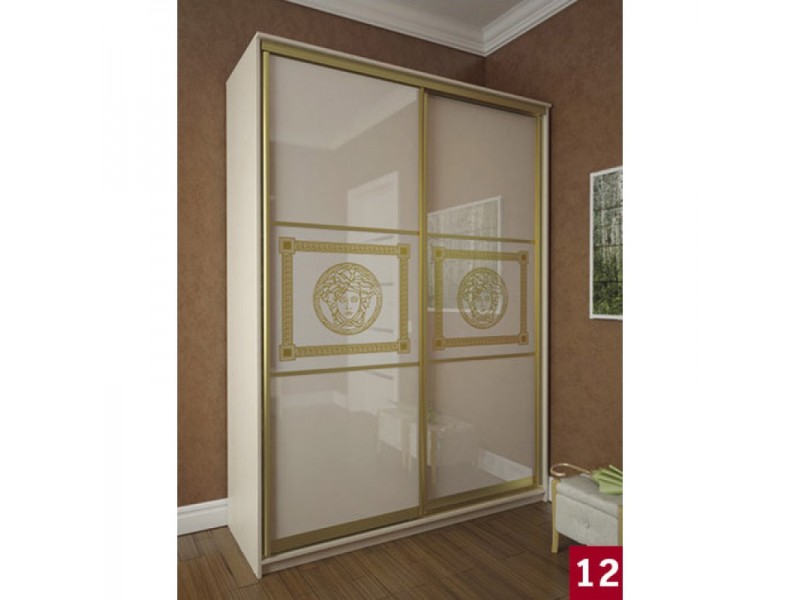Двери данной модели шкафа-купе выполнены из декоративного стекла лакобель молочного цвета с нанесённым рисунком всемирно известного бренда Versace.
