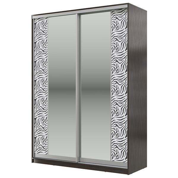 Яркий. стильный шкаф для модного интерьера. Двери данной модели шкафа-купе выполнены из комбинации зеркала и декоративного стекла лакобель с контрастным чёрно-белой рисунком. имитирующем расцветку зебры.