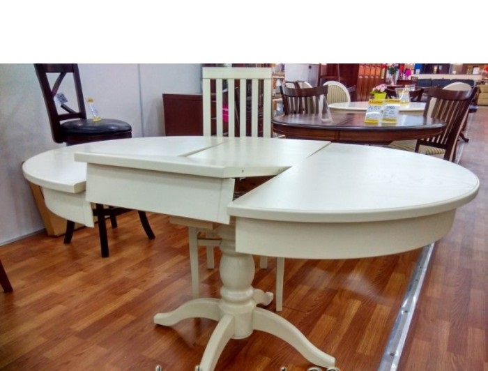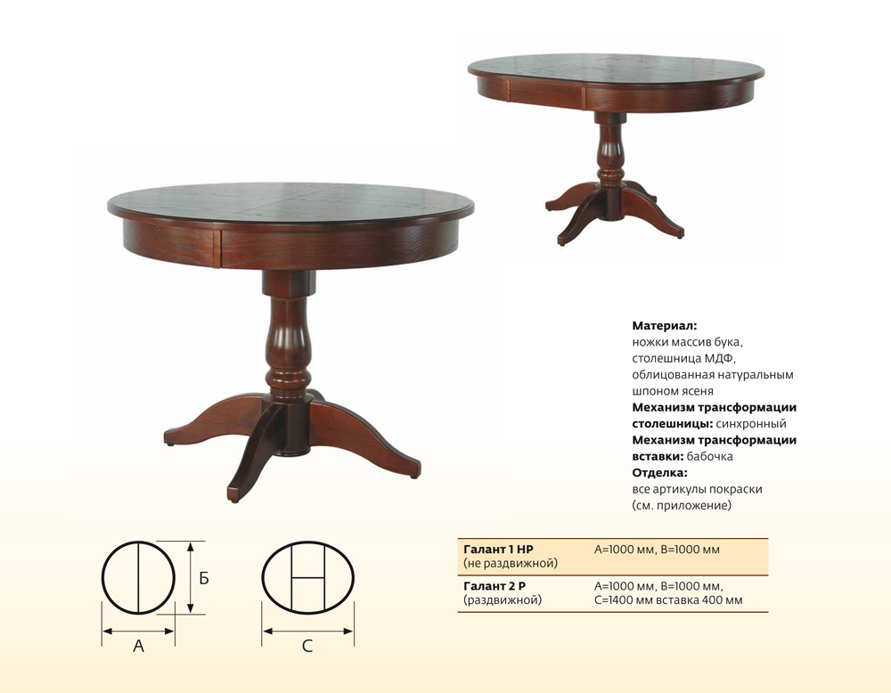 Ножки стола выполнены из массива бука, столешница МДФ покрыта натуральным шпоном ясеня. Данный стол можно заказать в 10 стандартных цветах. Так же он может быть декорирован патиной по структуре дерева, или по элементам резьбы. Патинирование по структуре подчеркивает красоту натурального дерева. Патина по элементам резьбы ставит акценты на красоте резных элементов. Классический круглый стол с удобным механизмом раскладки(бабочка)подойдёт для кухни и небольшой гостиной.