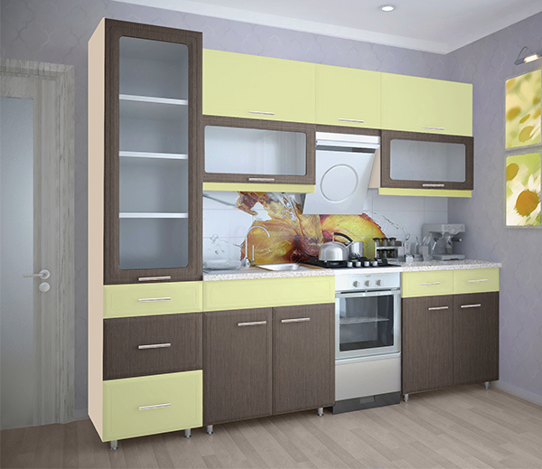 Каркас из ламинированной ДСП очень прочный и влагостойкий. Столешница из постформинга устойчива к выгоранию и царапинам, долговечна и гигиенична. Фасад кухни дополняют вставки из матового стекла, а стильные лаконичные ручки придают кухонному гарнитуру особую элегантность. Навесные шкафы оснащены газовыми амортизаторами, поэтому открываются совершенно бесшумно. А благодаря вместительным ящикам и полкам Вам не придется тратить время на поиск нужных продуктов и приборов.