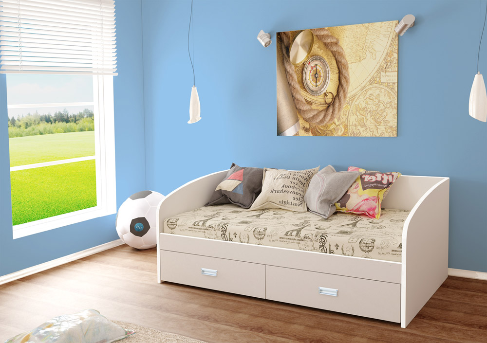 Изготовлена кровать из ламинированной ДСП в белом цвете. Конструкция создана обеспечивать полную безопасность и комфорт. Подлокотники с плавными округлыми контурами, как характерная особенность, позволяют выделиться данной модели кровати.