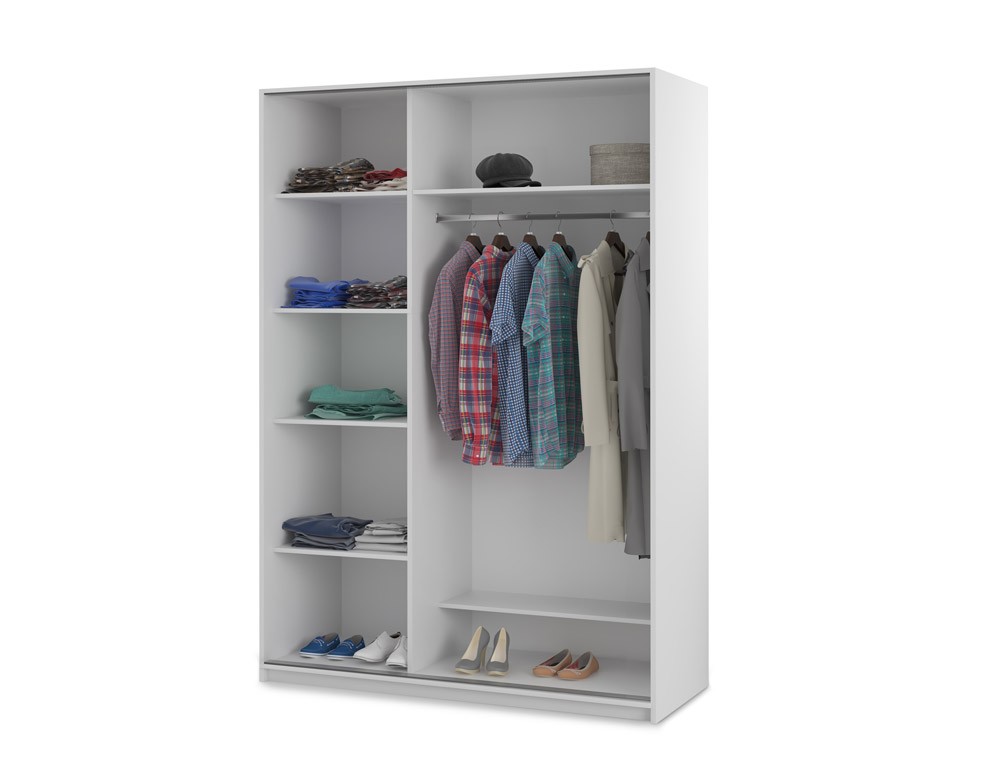 Корпус и двери шкафа выполнены из ламинированной ДСП. Его вместительная конструкция, позволяет хранить в себе много вещей и одежды. Просторное функциональное наполнение препятствует деформации вещей. Внутри есть глубокие полочки для одежды и головных уборов, а также широкий отсек для штанги с плечиками.