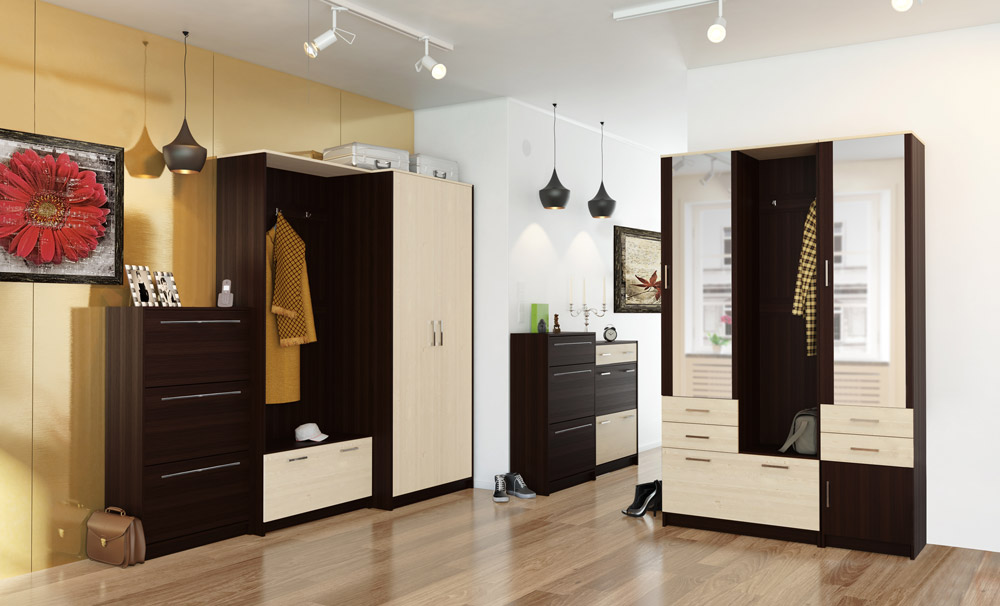 Тумба из ламинированной ДСП представлена комбинацией двух чередующихся оттенков. Конструкция – небольшая, но достаточно высокая и при этом обладает оптимальной вместимостью. Изделие предусматривает три закрытых отсека разного размера. Фасад дополнен изысканными ручками.