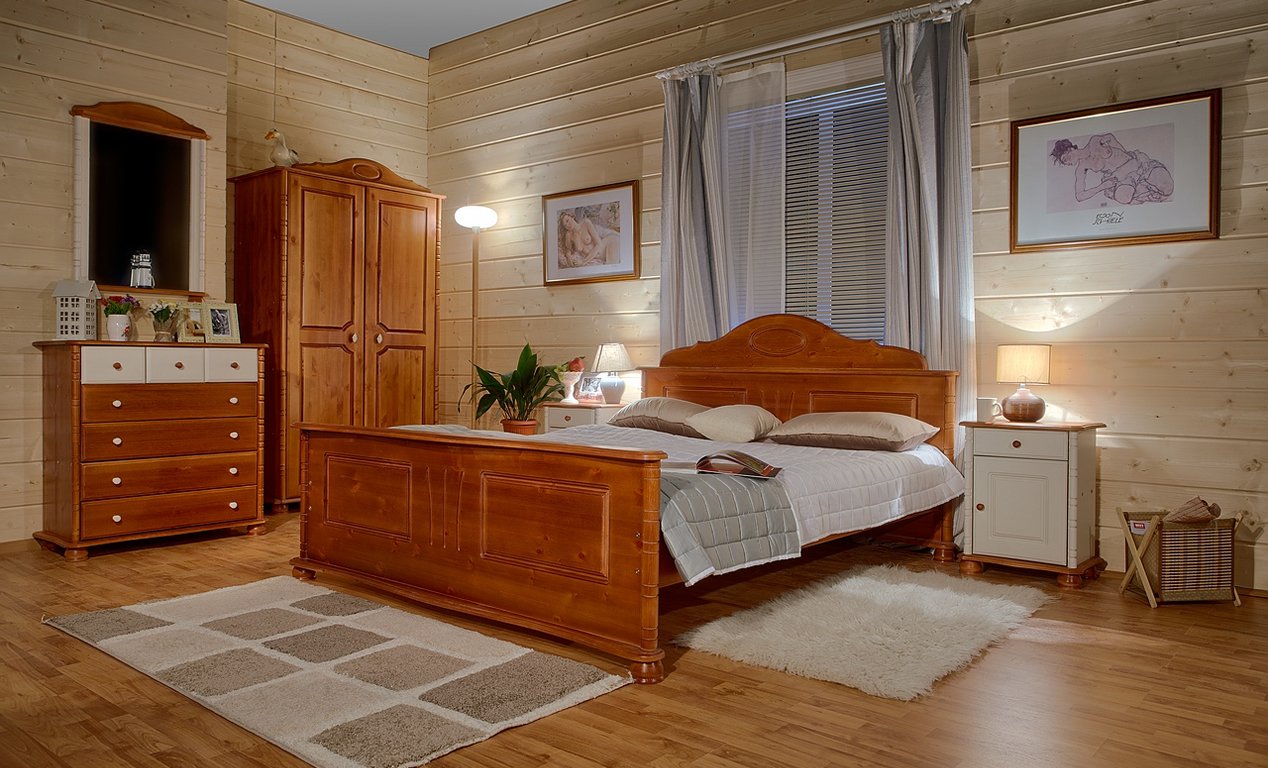 АЙНО кровать двуспальная - шикарная модель Timberica из массива добротной и капитальной сосны, выполненная в деревенском стиле. Акцентирование на выделке натурального мебельного материала и его структуре, волшебно-сказочные нотки, усложненные резные детали и формы ножек и спинок, дают эффект именно стиля кантри.