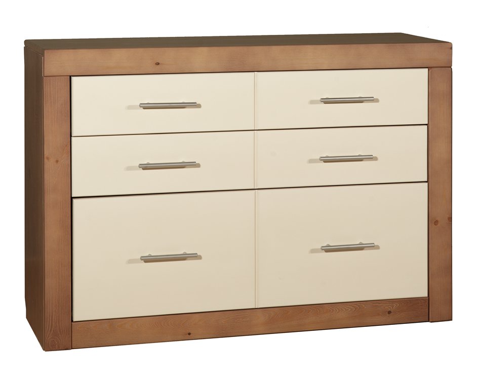 БРАММИНГ комод №1 из соснового массива, отличающийся привлекательными дизайнерскими решениями, - изделие фирмы Timberica, зарекомендовавшей себя с положительной стороны у российского потребителя. Комод имеет шесть вместительных ящиков на шариковых направляющих – два больших внизу, четыре поменьше вверху. Они выдвигаются легко и бесшумно, выдерживая при этом внушительную нагрузку. Этот предмет мебели, дополненными иными из одноименной коллекции меблировки поможет Вам в создании неповторимого и приятного интерьера. Ведь натуральное дерево – всегда являлось признаком теплого и уютного дома. Природные материалы и покрытия без запаха и химии делают комод экологичным – безопасным для жизни и здоровья Ваших и детей. Комод №1 серии БРАММИНГ доступен нашим заказчикам в любом цветовом исполнении, подходящим именно к Вашему интерьеру. Цените естественность и практичность? Тогда не раздумывайте! Приобретайте в нашем интернет-магазине БРАММИНГ комод №1 по вполне доступным ценам!
