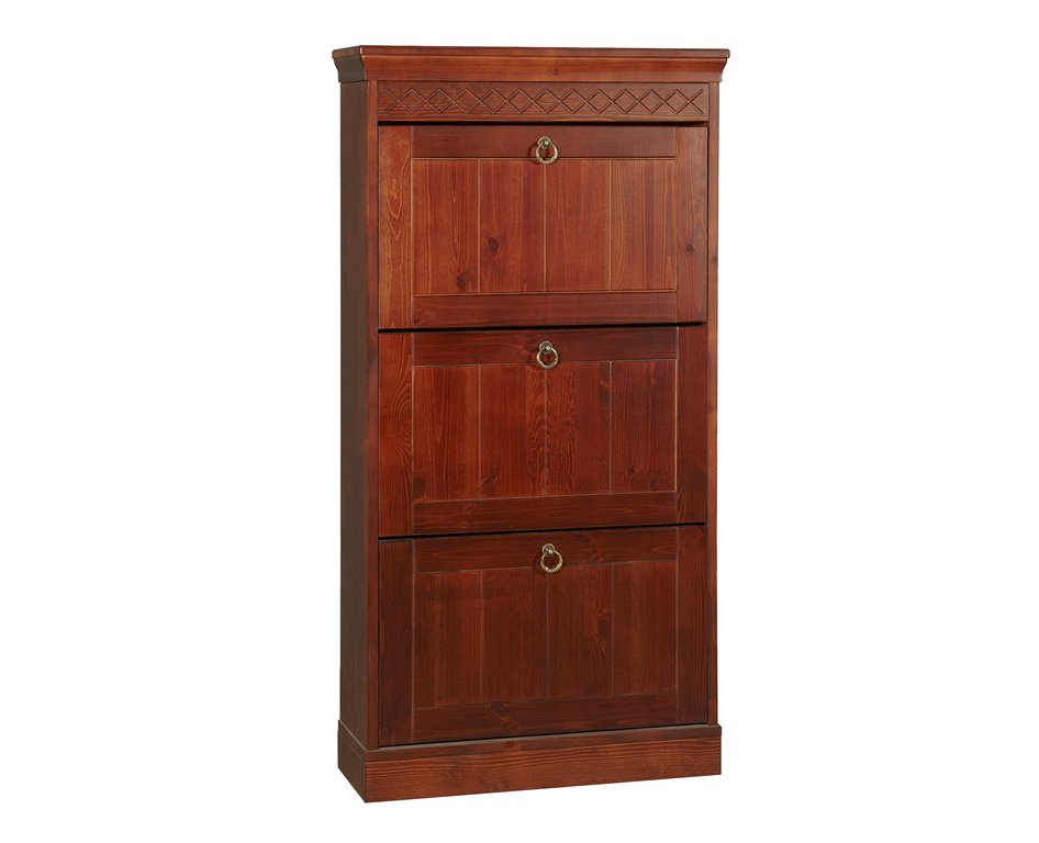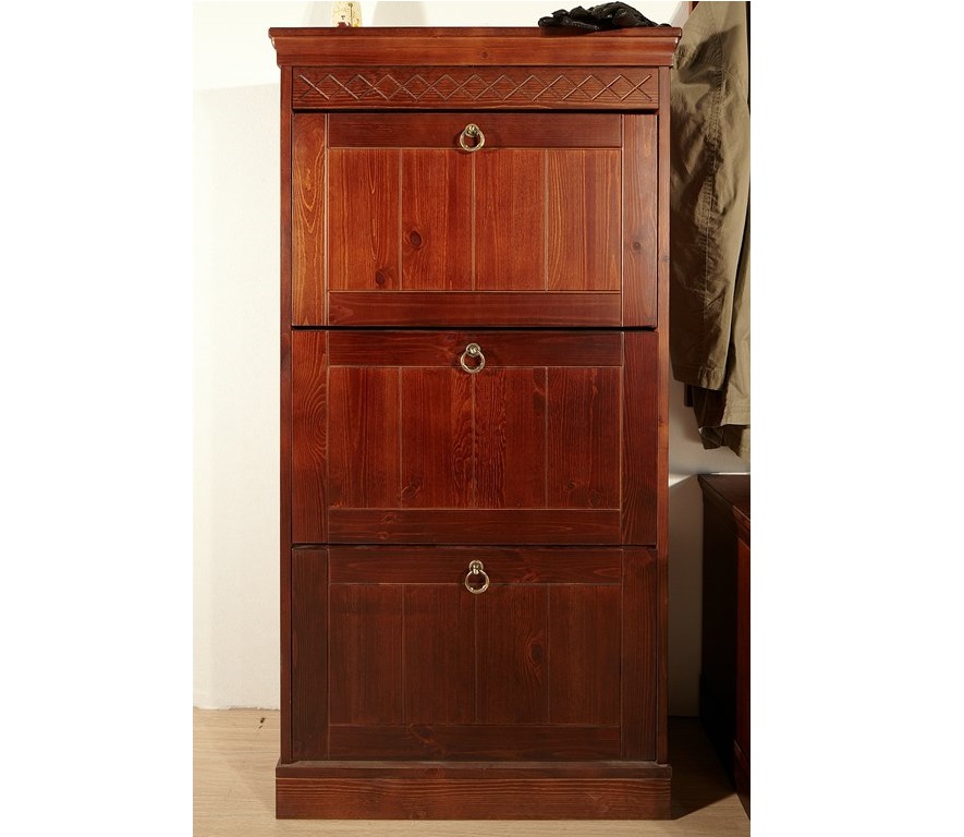 ДАНИЯ тумба для обуви №2 – привлекательный поместительный предмет мебели для Вашей современной и стильной прихожей, подходящий для размещения любой обуви (зимней и летней). Фирма Timberica производит это изделие в скандинавском стиле из массива прочной и надежной, привлекательной и экологичной сосны. Благодаря чему оно подходит для любого дома, где ценят безопасность и пользу для здоровья. Уже с порога Вы почувствуете неповторимые ароматы леса: сосны, хвои и смолы. Несмотря на небольшие размеры и то, что для тумбы требуется немного места, она очень функциональна. В тумбе для обуви №2 ДАНИЯ - три объемные секции с вместимостью до шести пар обуви в каждой. Все секции обустроены двумя полочками и откидным механизмом. Верхняя царга фасада украшена ненавязчивым резным рисунком. Изюминку внешнему виду фасада придают также небольшие металлические колечки фурнитуры. В нашем интернет-магазине возможен заказ удобных, практичных, надежных и элегантных тумб для обуви ДАНИЯ из дерева, как в одном цвете, так и комбинированном.