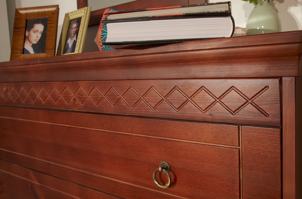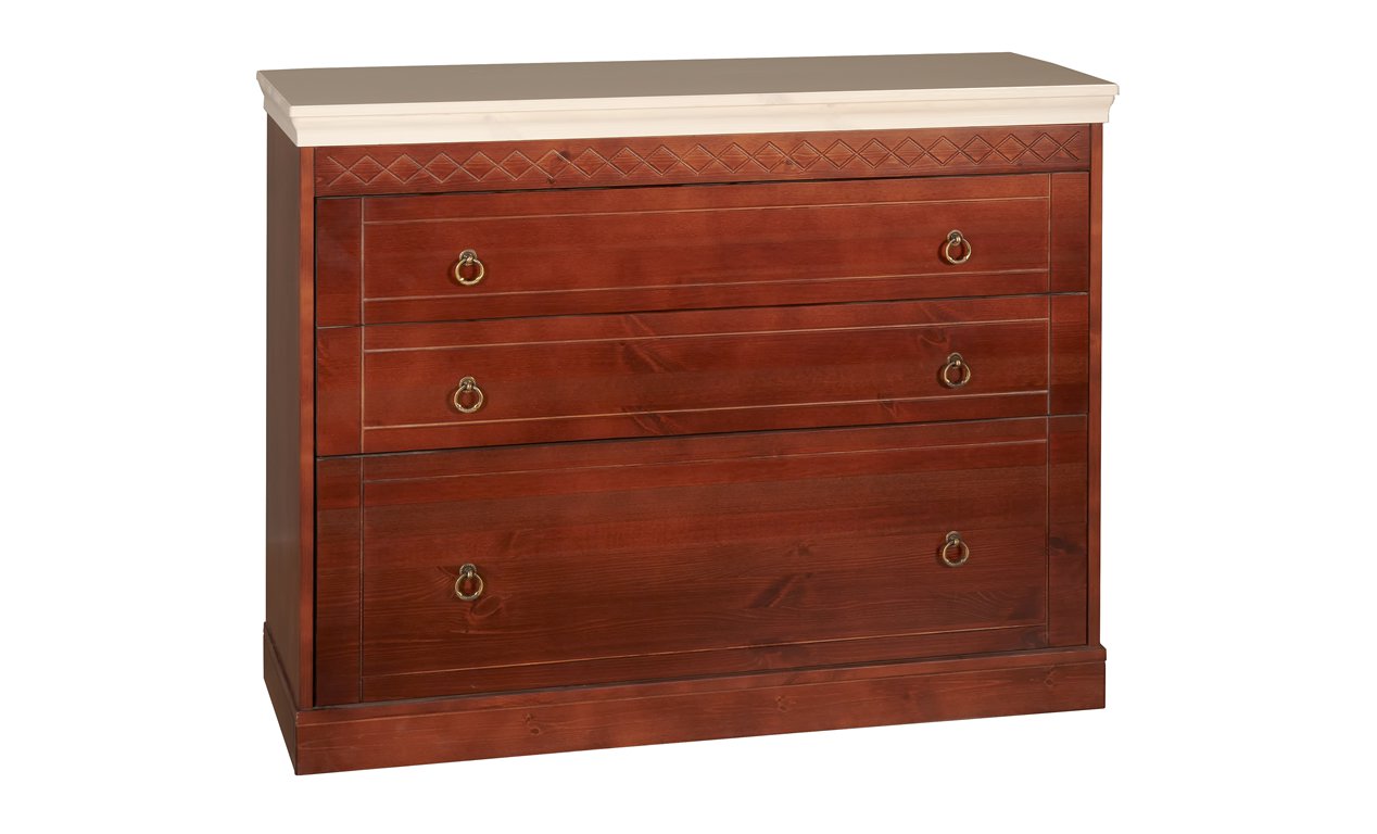 ДАНИЯ комод №2 - большая емкостная модель из деревянного массива природной сосны. Превосходный предмет меблировки из одноименной серии от Timberica для дизайнерско-интерьерного оформления спальни или гостиной в классическом духе. Три легковыдвижных ящика комода (большой нижний и два поменьше верхних) плавно и бесшумно передвигаются по шариковым направляющим. Они вместительны и выдерживают немалую нагрузку. Ненавязчивая привлекательная резьба декорирует верхнюю царгу. Металлическая фурнитура придает нотку шарма всей конструкции и фасаду, в частности. Широкая столешница дает возможность для размещения фотографий в стильных рамочках, шкатулок, комнатных растений и всяких мелочей. ДАНИЯ комод №2 производится из природного материала – массива долговечной высококачественной сосны и натуральной тонировки. Это делает мебель экологичной, приемлемой для использования в любом помещении, предназначенном, как для детей, так и для взрослых.