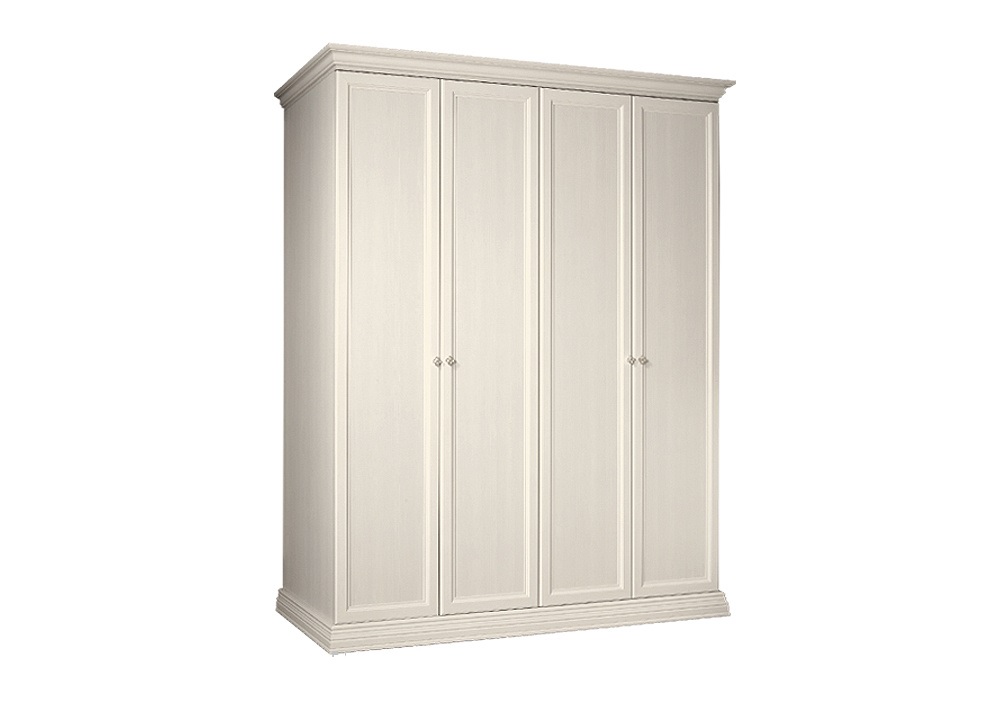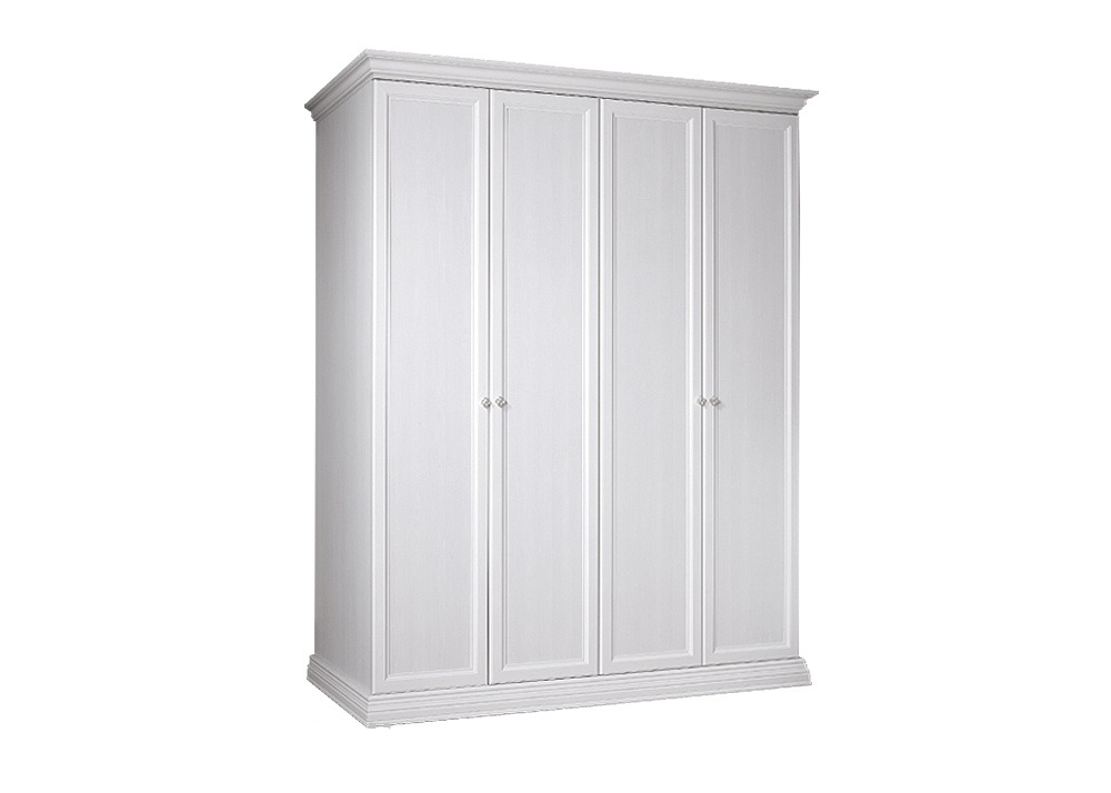 Шкаф 4-дв. для платья и белья Амели (Ярцево) - классический четырехстворчатый шкаф с распашными фасадами выполнен в трех цветовых исполнениях: штрих лак, выбеленный дуб и ноче. Минимум декора позволяет расположить шкаф в интерьере любого стиля. Цоколь и карниз выполнены в одном стиле и обеспечивают шкафу элегантность и завершенность силуэта. Распашные фасады оснащены петлями с доводчиками. Лицевая фурнитура - изящные металлические ручки.