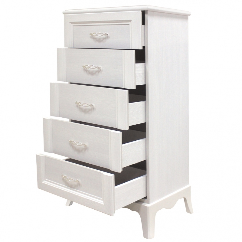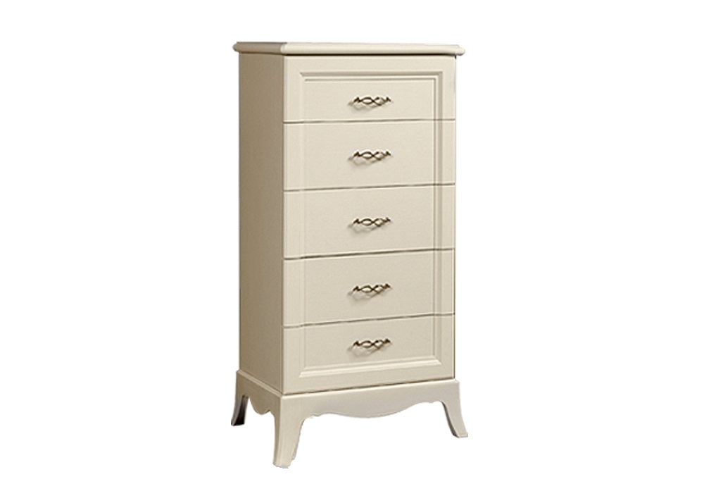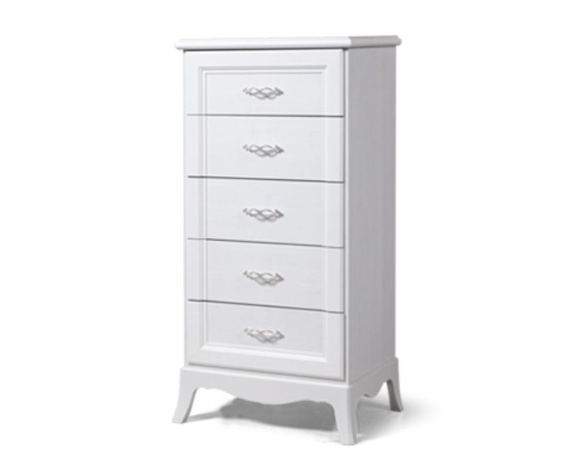 Комод узкий Амели (Ярцево) - удлиненный, выполненный в стиле Прованс, комод будет незаменим в компактном помещении гостиной, спальни, прихожей. Комод позволит разместить массу мелочей в пяти небольших ящиках со скрытыми бесшумными направляющими. Фигурное основание с выгнутыми ножками зрительно облегчает силуэт комода, а витиеватые металлические ручки украшают фасады ящиков.