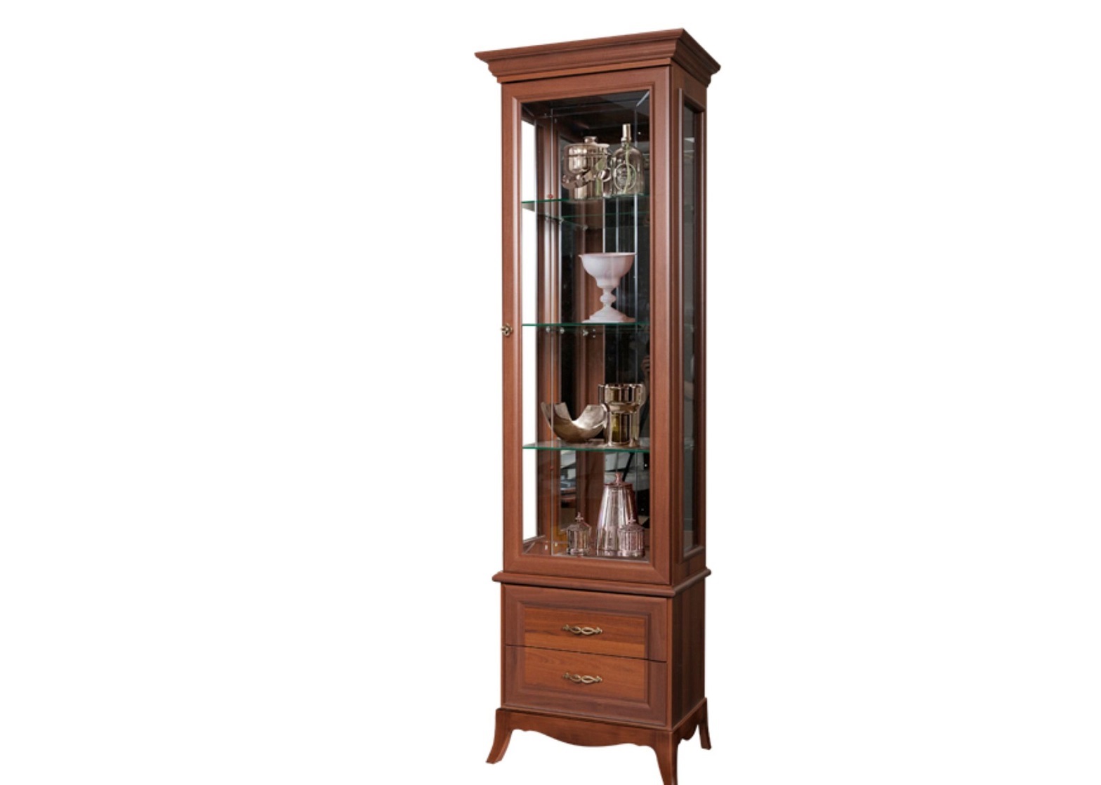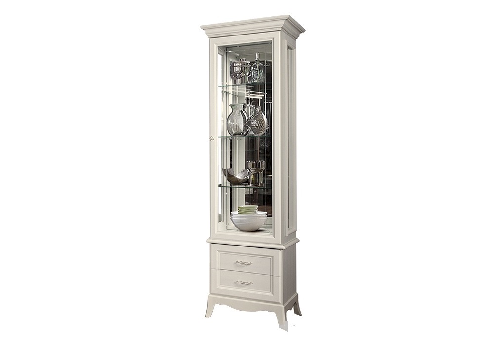 Витрина правая Амели (Ярцево) - элегантная витрина для посуды классического дизайна. На рельефном основании с выгнутыми ножками расположены два небольших выдвижных ящичка для мелочей, над которыми расположена застекленная с трех фронтальных сторон витрина. Стекла витрины декорированы лаконичной гравировкой. Наполнение - три стеклянных полки. Лицевая фурнитура - металлические фигурные ручки. Витрина представлена в трех цветовых исполнениях: штрих лак, выбеленный дуб и ноче.