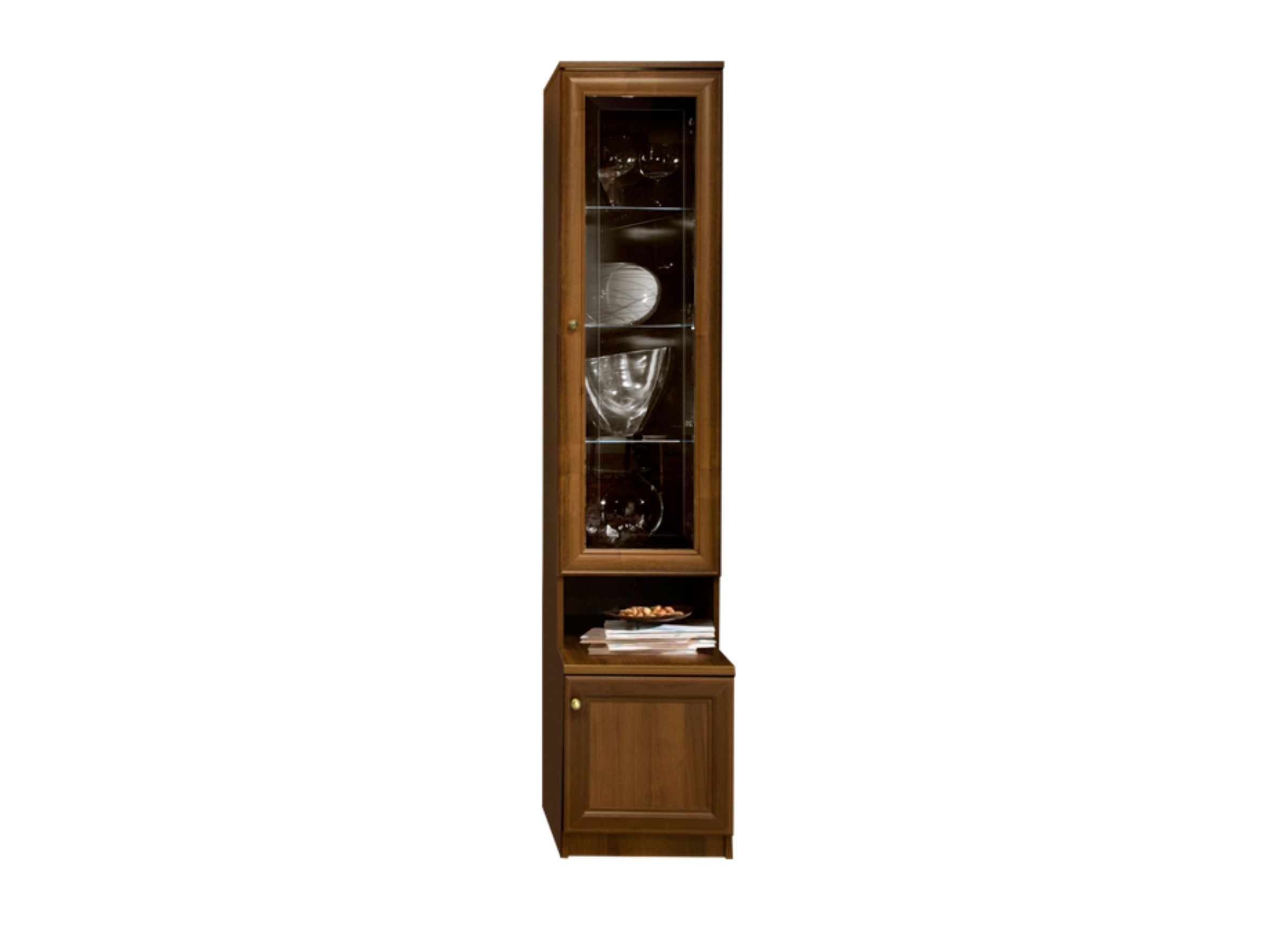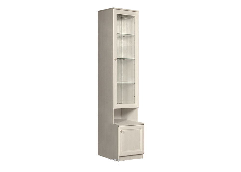 Пенал с витражом правый Амели (Ярцево) - классический пенал-витрина правого расположения для гостиной или столовой выполнен в трех цветовых исполнениях: штрих лак, выбеленный дуб и ноче.. Над нижним, увеличенным в глубину, отделением с распашным фасадом расположена небольшая ниша. Над нишей - отделение с тремя стеклянными полками за распашным застекленным рамочным фасадом. Стеклянная вставка фасада по периметру декорирована лаконичной гравировкой. Распашные фасады укомплектованы петлями с доводчиками. Лицевая фурнитура - витиеватые металлические ручки.