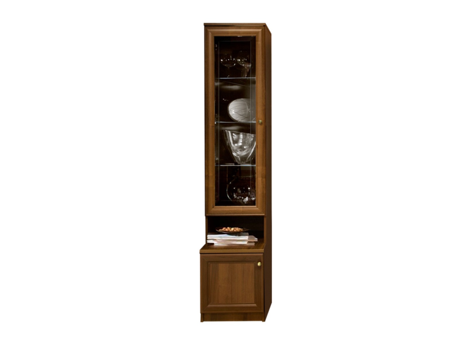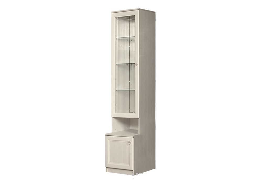 Пенал с витражом левый Амели (Ярцево) - классический пенал-витрина левого расположения для гостиной или столовой. Над нижним, увеличенным в глубину, отделением с распашным фасадом расположена небольшая ниша. Над нишей - отделение с тремя стеклянными полками за распашным застекленным рамочным фасадом. Стеклянная вставка фасада по периметру декорирована лаконичной гравировкой. Распашные фасады укомплектованы петлями с доводчиками. Лицевая фурнитура - витиеватые металлические ручки. Пенал выполнен в трех цветовых исполнениях: штрих лак, выбеленный дуб и ноче.
